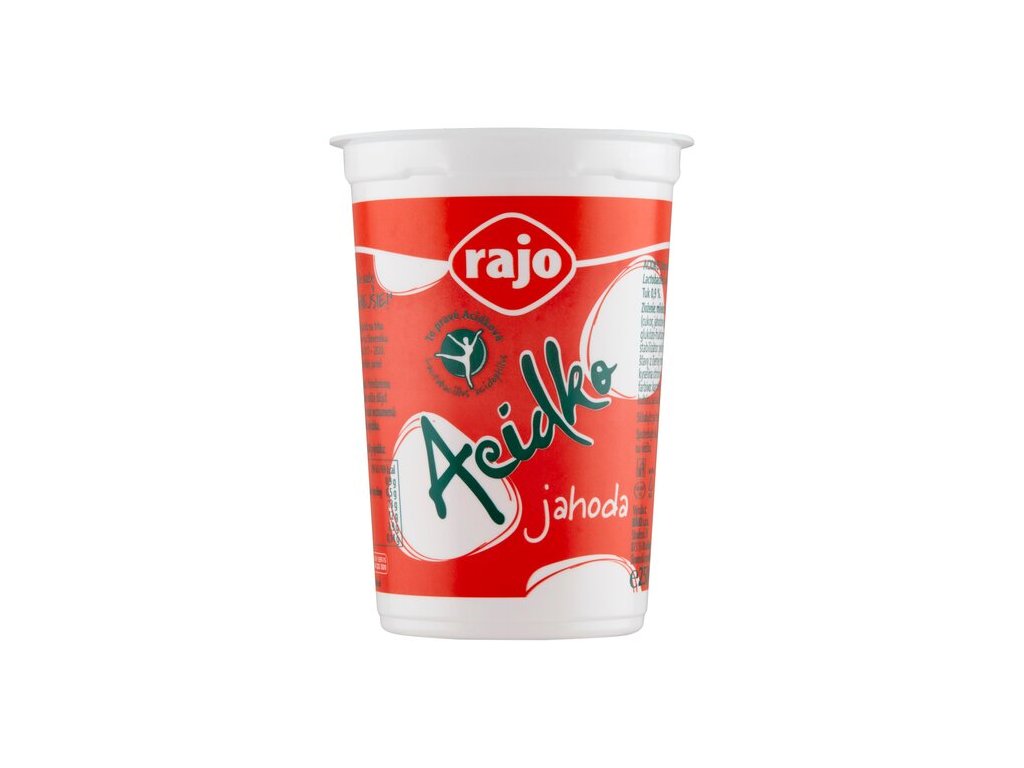 Mlieko, Ovocná zložka 16 % (cukor, jahodové pyré 20, 5 %, glukózo-fruktózový sirup, jahody 9, 5 %, stabilizátor: pektíny; farbiaci koncentrát šťavy z čiernej mrkvy, regulátory kyslosti: kyselina citrónová, citrany sodné; arómy, farbivo: karotény), Smotanová kultúra, Kultúra Lactobacillus acidophilus, Tuk 0, 9 %