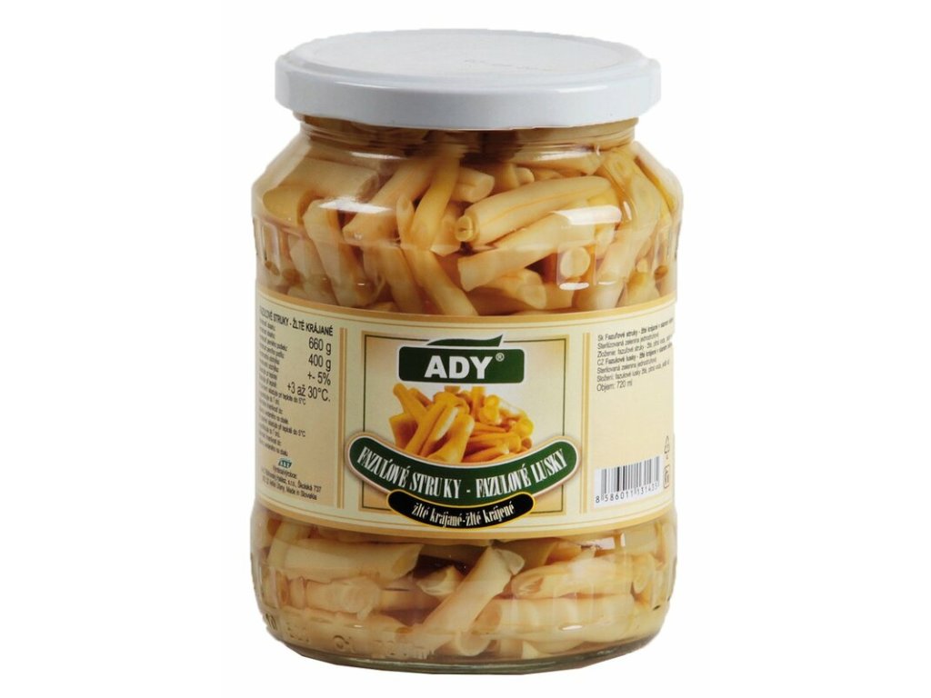 fazuľové struky-žlté krájané, pitná voda, jedlá soľ, regulátor kyslosti- kyselina citrónová.