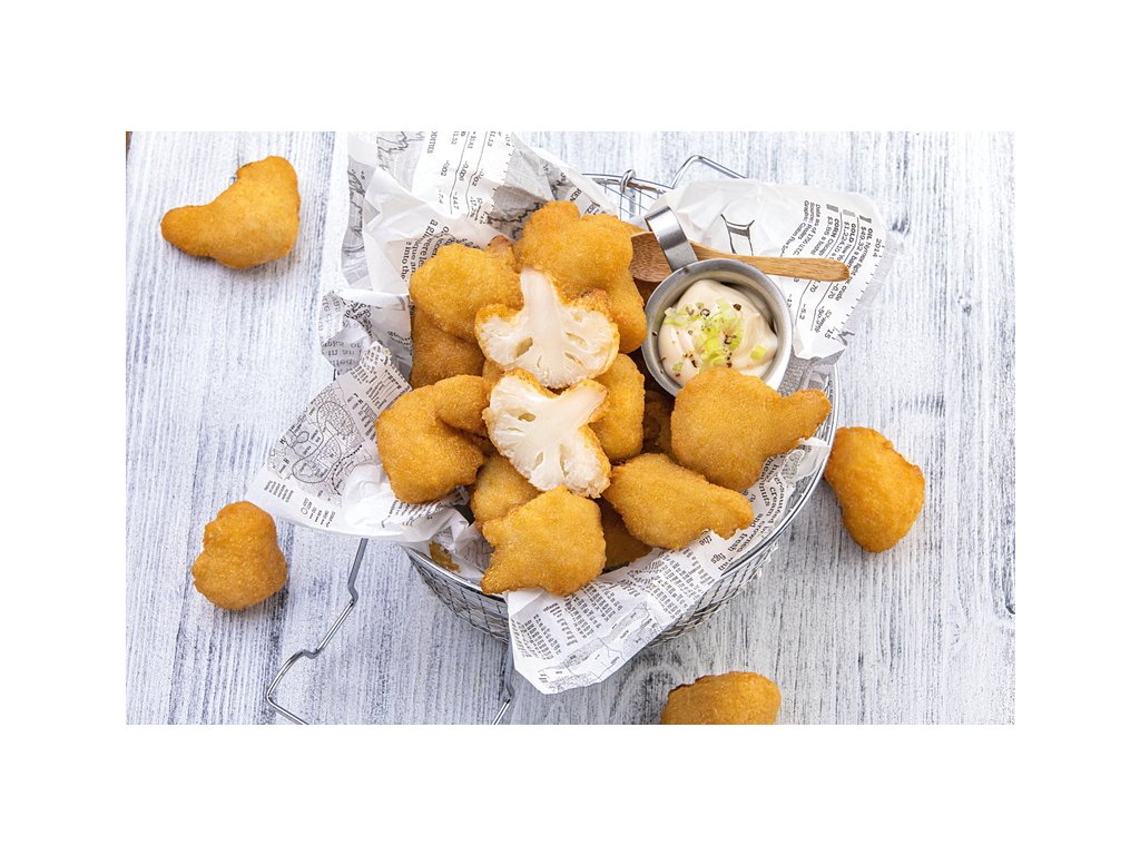 karfiol, obaľovacia zmes: 70% strúhanka, 10% hladká múka, 7,1% pasterizovaná vaječná melanž, 0,48% pasterizovaný vaječný bielok, 0,24% soľ.